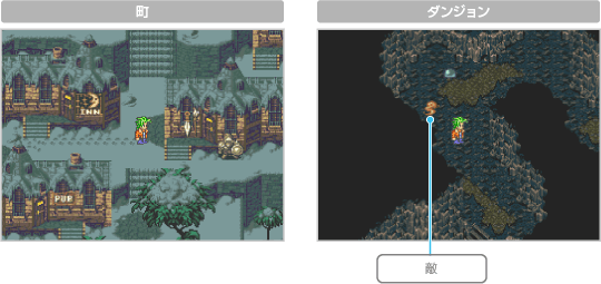 ゲームの中心となる画面です。フィールドには町やダンジョンなどがあります。