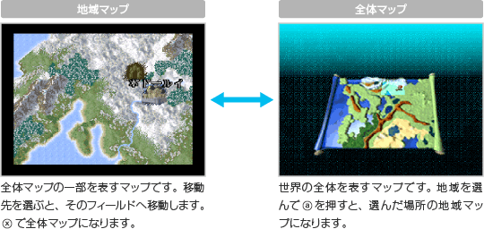 フィールドからほかのフィールドへ移動するときに表示される画面です。地域マップと全体マップの2つがあります。 ![]() |