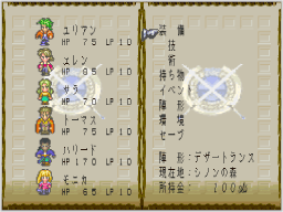 メニューを選んで、冒険の準備をしたり、セーブをしたりする画面です。パーティにいるキャラクターのステータスを見ることもできます。 |