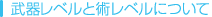 武器レベルと術レベルは、キャラクターの武器や術の熟練度を表し、戦闘時に武器や術を使っていると種類に応じて上がっていきます。レベルが高いほど、それぞれの武器や術で攻撃したときのダメージが大きくなります。なお、術レベルは覚えている術の系統のみ表示されます。 ![]() |