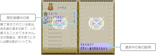 覚えている術を確認します。 装備中の術は、術→ほかの術の順に選ぶと、位置を入れ替えることができます。なお、術は術ショップで購入すると装備して使えるようになります。 ![]() |