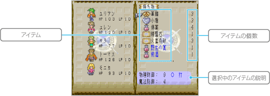 アイテムを使ったり、捨てたりします。アイテムを使うときは、青色で表示されているアイテムを選んで アイテムを捨てるときは、捨てたいアイテム→「すてる」の順に選んでください。アイテム→ほかのアイテムの順に選ぶと、位置を入れ替えることができます。 また、黒色で表示されたアイテムは、戦闘中のみ使うことができます。メニュー画面で使うことはできません。 ![]() |