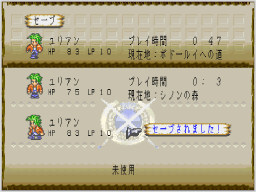 現在の進行状況を保存(セーブ)します。セーブする場所を3つのなかから選んでください。フィールドにいるときであれば、いつでもセーブできます。 |