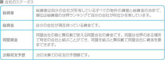 買収劇が終わると決算が発表されます。決算では資金が増えたり減ったりします。 なお、決算の直後にほかの会社が物件を狙って買収劇をしかけてくることがあります。ほかの会社がしかけてきた買収劇に失敗した場合、競りかけた資金は戻ってこないので注意してください。 |