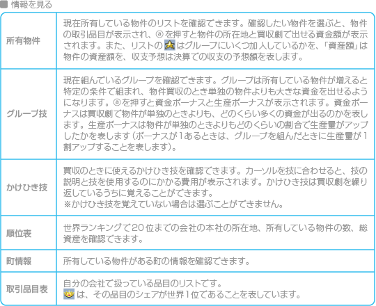 所有している物件や、取引品目が同じ物件を持っている場合にできる「グループ」に関する詳しい情報、買収劇で使用できる「かけひき技」などを確認できます。 |
