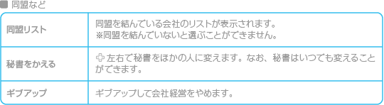 同盟を結んでいる会社を確認したり、秘書を変えたり、ギブアップして商売をやめたりします。 |