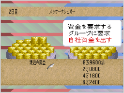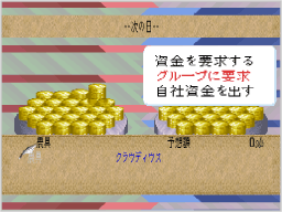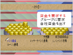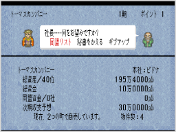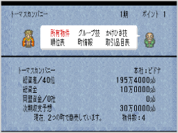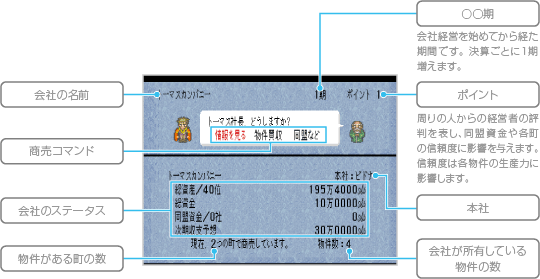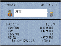 町のなかで商売関係の人に話しかけると下のような画面になり、会社のステータスや商売コマンドが表示されます。 ![]() ![]() |