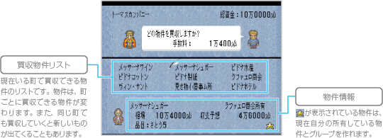 トーマスが主人公か仲間にいるときに特定の条件を満たすと、会社経営のイベントを行えます。世界各地の物件を買収するなどして自分の会社を大きくし、総資産1億オーラムをめざしてください。 |