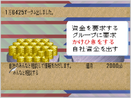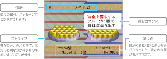 商売コマンドの「物件買収」で買収したい物件を選ぶと、買収劇が始まります。買収劇では 買収コマンドを選んで自分の持っている物件やグループなどから資金を集めたり、自分の会社から資金を出したりして、目当ての物件をほかの会社と競り(せり)合います。背景の青いストライプが左端に到達すると買収は成功となり、物件を入手することができます。反対に、赤いストライプが画面右端に到達すると買収は失敗となります。 ![]() |