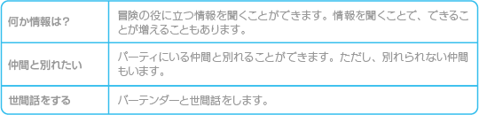 集まっている人にいろいろな情報を聞くことができます。なお、カウンターでバーテンダーに話しかけると以下のメニューが表示されます。メニューを選んで、情報を聞いたりパーティの仲間と別れたりすることもできます。