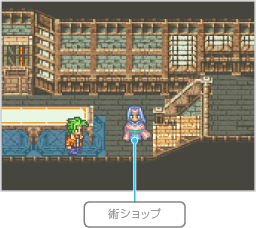 町には冒険に役立つさまざまな施設があります。道具屋で装備品や道具をそろえたり、宿屋でLPなどを回復したり、パブで情報収集をしたりできます。 |