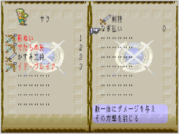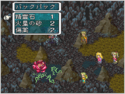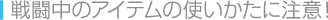 | 戦闘中に使うアイテムは、陣形がファイターモードのときとコマンダーモードのときで使いかたが違います。味方の一人ひとりにコマンドを出すファイターモードでは、装備しているアイテムしか使えません。反対に、パーティ全体にコマンドを出すコマンダーモードでは、装備していないアイテムしか使えません。メニュー画面の「陣形」でモードを切り替えたときは、アイテムの装備状況の確認を忘れないでください。 | ![]() |