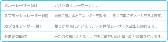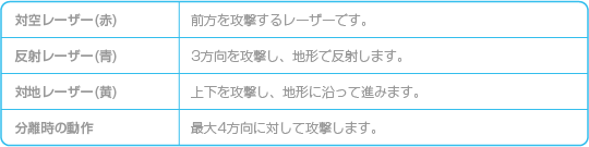 フォースは3種類あり、ゲーム開始時に使用するものを選ぶことができます。 それぞれフォースがある状態でレーザークリスタルを取ったときの攻撃方法と、分離中の動作が異なるので、使用中のフォースに合わせた戦い方を考えましょう。 |