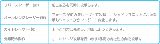 このフォースが出現すると、支援兵器のシャドウユニットも同時に現れ、全方位を攻撃することができます。また、合体と分離が高速で行えます。 |