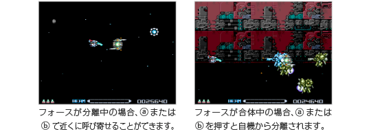 分離中のフォースは自機に近づくと、接した方向によって自機の前方または後方に合体します。 フォースは敵の攻撃でダメージを受けません。また、「レーザークリスタル」を取ることで成長し、合体時にはその色に応じたレーザーで攻撃できるようになります。 ![]() |