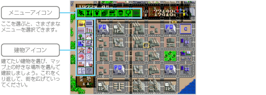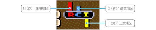 画面右上の要求インジケーターには、街の基本となる三大地区(住宅地区、商業地区、工業地区)が、現在どのくらい住人に必要とされているかが示されます。それぞれのグラフが上に伸びているほど、その建物が必要であることを表し、下に伸びているほど建物が余っていることを表します。建物を建てるときの参考にしましょう。 ![]() |