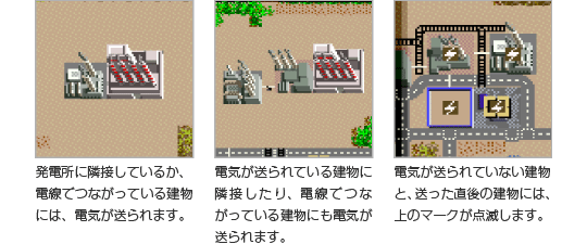 多くの建物は、発電所で作られた電気が送られてこなければ機能しません。 電線を活用して、しっかり街中に電気が行き渡るように気を配りましょう。 ![]() ※道路、線路、公園などは電気を必要としません。 ※建物同士がカドで接している場合、電気は送られないので注意しましょう。 |