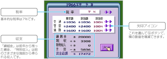 毎年1月になると予算画面が表示され、その年の予算が計算されます。必要に応じて税率や、交通・警察・消防に割り当てる予算を変えたあと、「決定」を選ぶと収支に合わせて残り資金が増減します。なお、税率を上げたり各機関の予算を減らすほど資金が増えますが、住人からの評価が落ちるなど、さまざまな悪影響があるので気をつけましょう。 ※予算画面が表示されてから一定時間が経つと、自動的に現在の数字で予算が決定されます。 ※メニューアイコン「インフォメーション」の「予算」で、翌年の予算を変更できます。 ![]() |