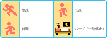 ゲーム内での時間の進みかたを変更できます。 ゲーム開始時の設定は「低速」です。 |