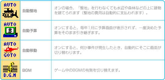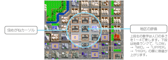![]() ※商業地区の人口は1〜5です。また、工業地区の地価は「LOW」と「HIGH」の2種類です。 ※隣り合う住宅地区(または商業地区)同士が発展すると、合体してランク「TOP」となります。 |