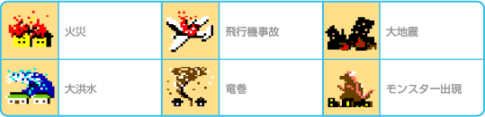 選んだ災害を意図的に起こすことができます。 なお、複数の災害を同時に起こすこともできます。 ※飛行機事故を選んだ場合、「空港」がなければ災害は発生しません。 |