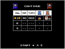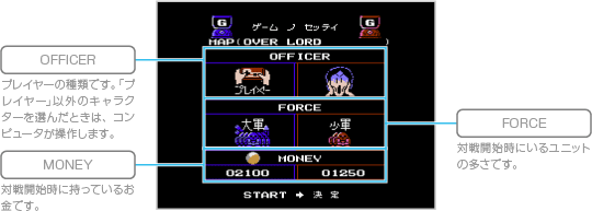 マップや初期状態の資金などを選び、初めから対戦を開始します。以下の順に対戦の設定を行ってください。
