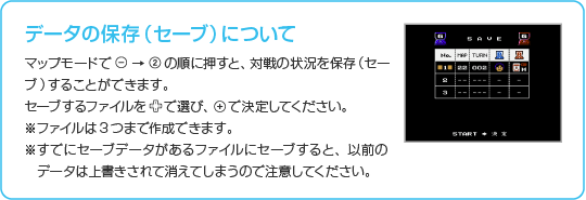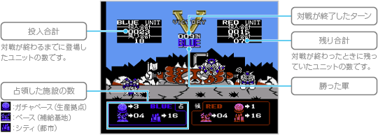 マップモードでの戦いは、「BLUE」軍のフェイズと「RED」軍のフェイズを交互に行うことで進みます(1Pが「BLUE」、2Pが「RED」を担当します)。フェイズとは行動する順番のことで、「BLUE」のフェイズと「RED」のフェイズが1回ずつ終わると1ターン終了となり、次のターンに進みます。 自軍フェイズの開始時には、都市や補給基地からの収入があり、生産中のユニットがあれば配備されます。1回のフェイズでは、ユニットの移動、戦艦による攻撃、新ユニットの生産などの行動を、12回まで行うことができます。 ![]() |