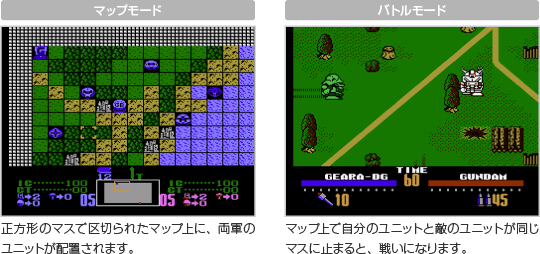 マップモードではユニットを動かしたり、新しいユニットを生産したりできます。自分と敵のユニットが重なると、バトルモードに移って戦います。 ![]() |