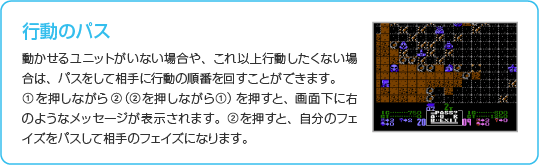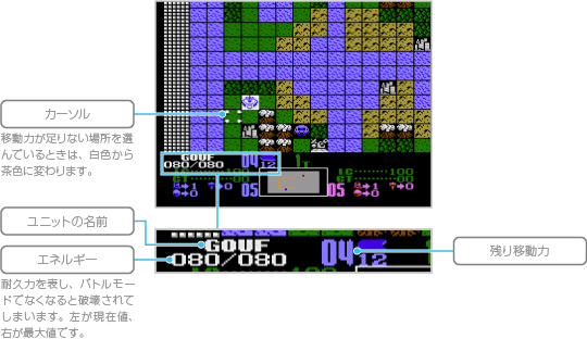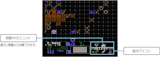 戦艦は移動するほかに、マップモード上で敵ユニットを遠距離攻撃できます。また、戦艦に搭載しているユニットを、戦艦から出撃させることができます。戦艦にカーソルを合わせて