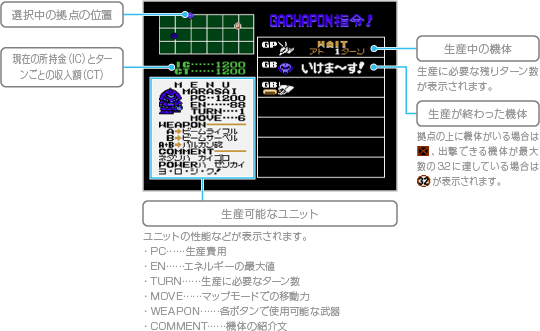 マップモードでは、1フェイズ中に以下の行動ができます。行動は最大12回まで可能ですが、同じユニットを2回行動させたり、同じ生産拠点での生産を2回行うことはできません。生産中の首都や拠点、行動を終えたユニットには、「E」のマークが表示されます