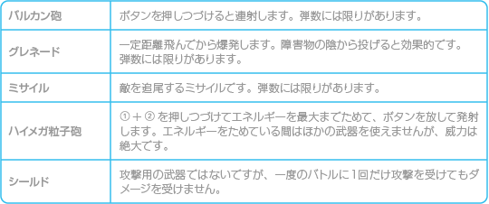 ※一部の武器やシールドには、使用回数が限られているものがあります。