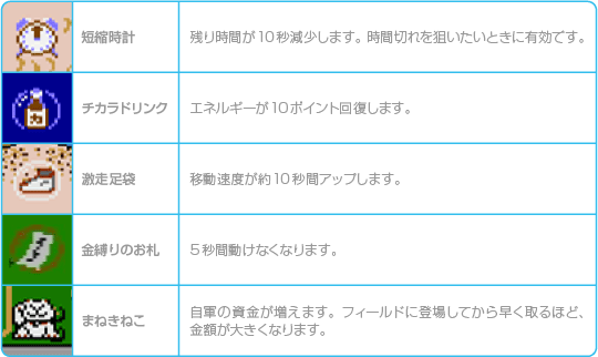 バトル中は、フィールド上にアイテムが登場することがあります。これらを取ると、さまざまな効果が発生します。 |