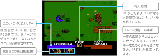 マップモード中、敵ユニットのいるマス(または敵の首都)にユニットが入ると、バトルモードが始まります。ユニットを操作し、1対1のアクションバトルで敵を倒すと勝利です。 |