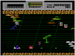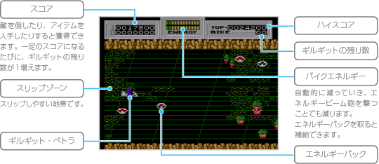 敵はエネルギービーム砲を当てることで倒すことができます。バスラ・バイク(バイクに乗った敵)は、体当たりで弾き飛ばして障害物や壁にぶつけることでも倒すことができます。 |