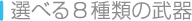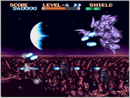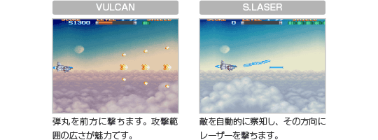 武器は「VULCAN」「LASER」「ATOMIC」「HOMING」「EXPLODE」「S.LASER」「PHOTON」「GRENADE」の8種類があります。得意な武器で戦ったり、ステージに合わせて選ぶなど、多彩な戦いかたができます。 ![]() |