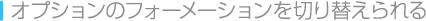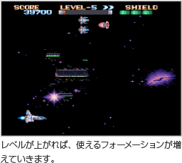 | XA-1は、自機とともに攻撃する「オプション」をつねに搭載していて、いつでもフォーメーションを切り替えられます。敵の数や武器に応じて、臨機応変にフォーメーションを切り替えると、戦闘を有利に進めることができます。 |
