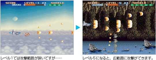 XA-1は、ロールプレイングゲームのように敵を倒した得点分の経験値が貯まっていき、一定の値になるとレベルアップします。レベルアップすると各武器の攻撃が強力になっていきます。 ![]() |