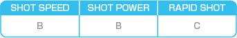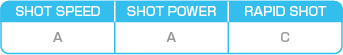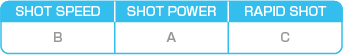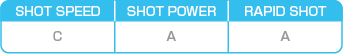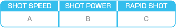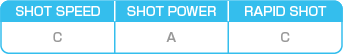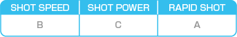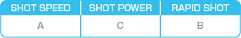 武器の性能は、優秀な順にA〜Cで表されます。「SHOT SPEED」はショットの速さ、「SHOT POWER」は武器の攻撃力、「RAPID SHOT」は連射の速さを表します。