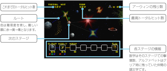 ステージとステージの間にはマップ画面が表示され、これまでにたどったルートや各ステージでの最高撃墜数を確認することができます。確認したら ※マップ画面は