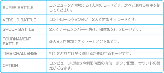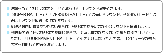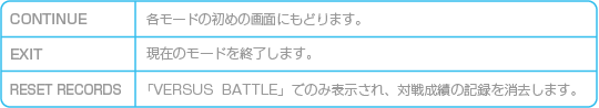 「SUPER BATTLE」以外のモードでは、対戦がすべて終わると結果が表示されます。このとき ![]() |