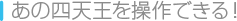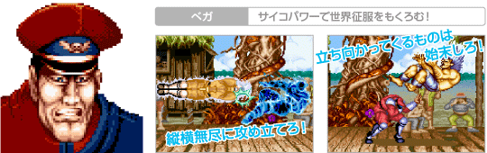 前作では敵として登場し、多くのプレイヤーを苦しめたであろう「M.バイソン」「バルログ」「サガット」「ベガ」の四天王。本作では彼らを自分で操作できます。強力な必殺技を持つ彼らを使いこなし、対戦での勝利をめざしましょう。 ![]() |