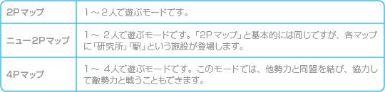 モードを3種類から選ぶことができます。モードによって参加できるプレイヤーの人数や、選べるマップの種類が変わります。 |