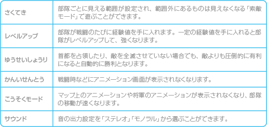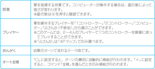 タイトルメニューで「開戦」を選ぶと、以下の手順でゲームを最初から始めることができます。 |