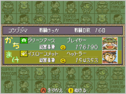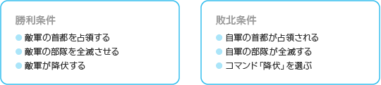 以下の勝利条件または敗北条件のいずれかを満たすと、戦いが終わり、戦闘結果が表示されます。 ※「4Pマップ」の場合は、敵のすべての勢力が敗北条件を満たすと、勝利となります。 |