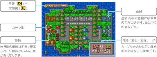 を押して施設や部隊に生産や移動などの指示を出してください。