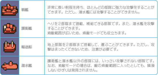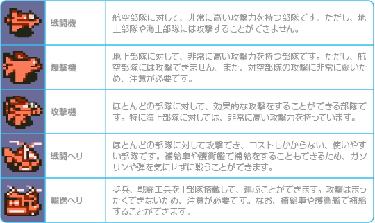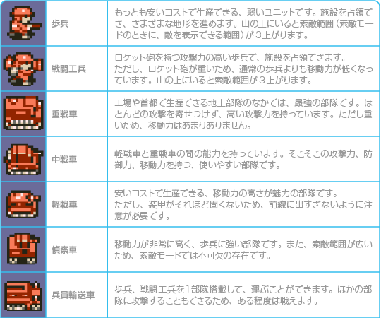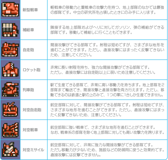 このゲームに登場する部隊を紹介します。軍事費や戦略に応じて、生産する部隊を選んでください。