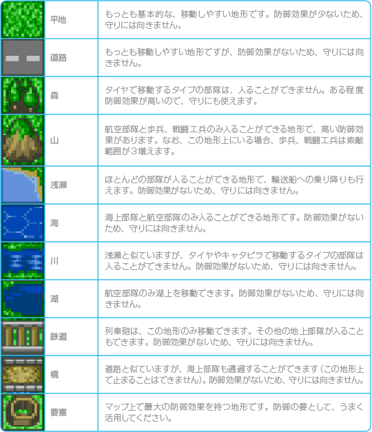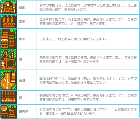 戦場にある施設や地形は、そこにいる部隊の防御力に影響を与えます。また、施設は占領することによって、部隊の補給や生産に利用でき、毎ターンごとに軍事費を徴収することができます。
