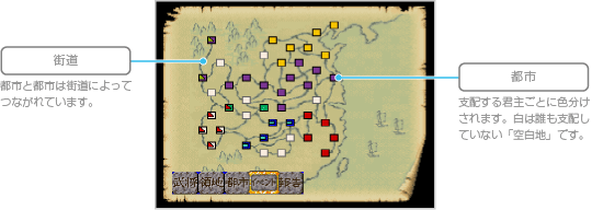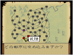 中国大陸はさまざまな「都市」に分かれ、武将を配置すると都市を支配できます。 すべての都市を支配するとゲームクリアです。 ![]() |