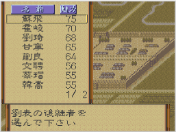ゲーム中、戦争や寿命により君主が死亡した場合は、配下の武将を後継者としてゲームを続行できます。配下の武将がいない状態で君主が死亡するとゲームオーバーです。 |