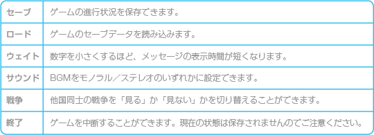 を押すと6つのコマンドが表示され、ゲームのセーブ・ロードやさまざまな設定が行えます。